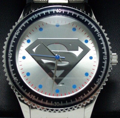 he Man of Steel will keep you timely with the Superman Returns: The Man of Steel Watch! This silver-tone alloy bracelet watch comes with a silver enamel bezel with a printed graphic pattern and a metallic silver dial with an embossed shield logo. The number markers are applied on the dial, and the watch comes with accented watch hands. Packaged in a collectible box with the Superman logo, each watch comes with a Certificate of Authenticity numbered to 500 pieces.